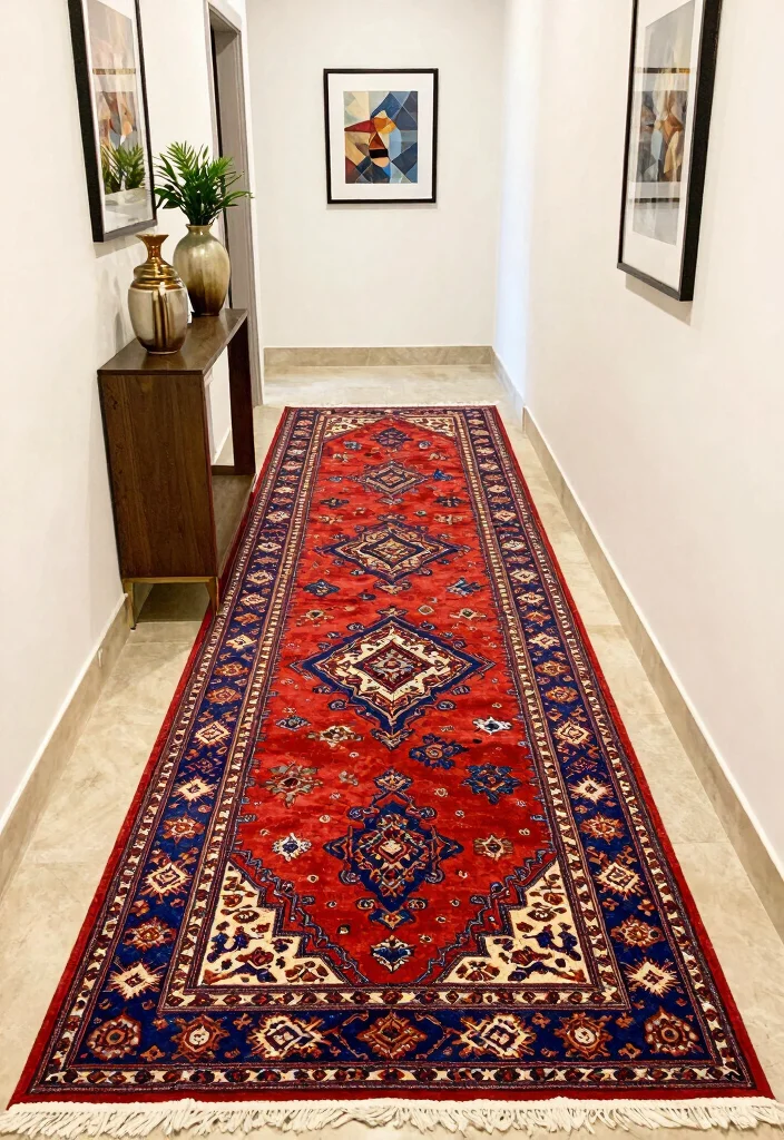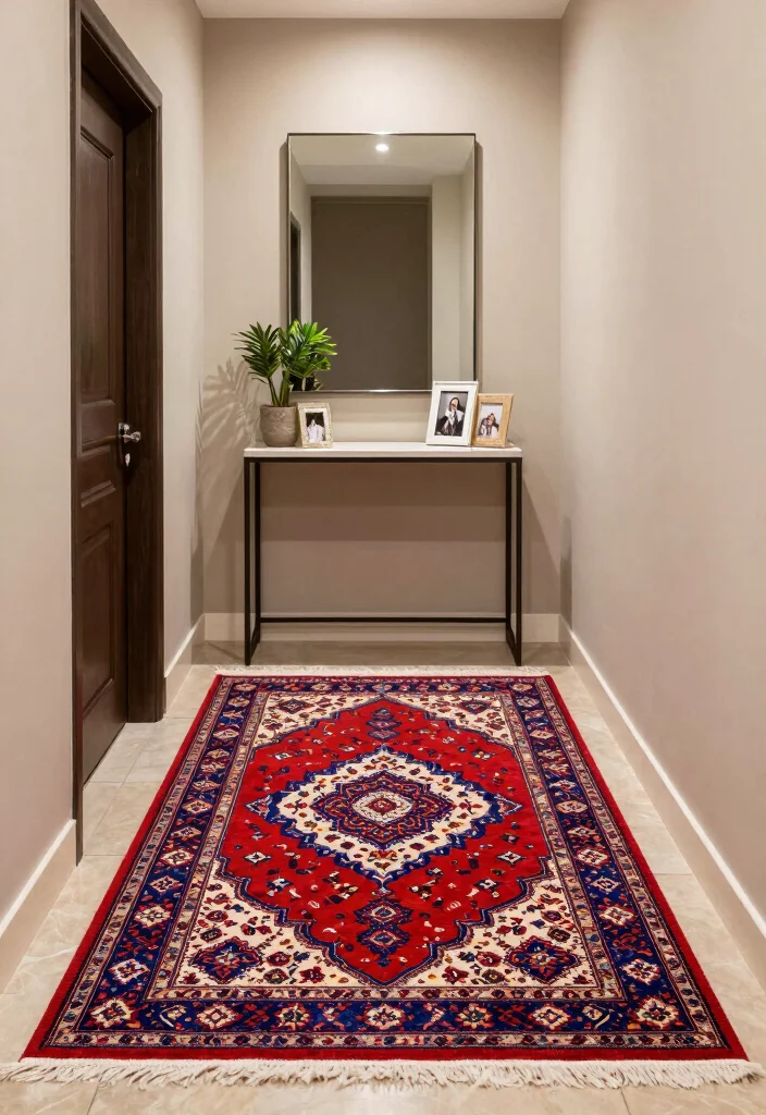 Introduce a splash of color and style in long, narrow hallways with a striking Arabian rug. A runner-style rug can visually elongate the space while adding rich texture and warmth. Choosing a rug with bold patterns draws the eye down the hallway, creating a sense of flow and movement.