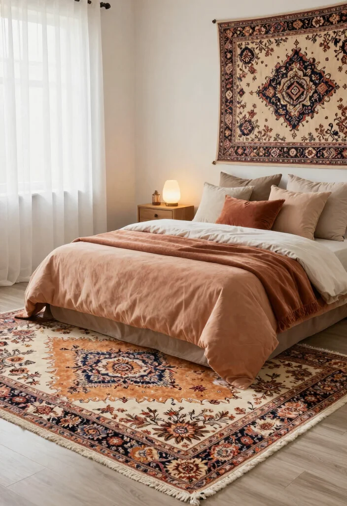 Transform your bedroom into a luxurious sanctuary with a plush Arabian rug underfoot. Selecting a soft, muted color palette that complements your bedding will not only enhance warmth but also add depth to your space, making it feel inviting and serene. A large, ornate rug positioned beneath your bed creates a soft landing spot for your feet each morning.
