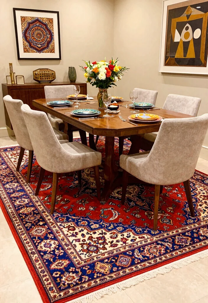 With Arabian rugs anchoring your dining room, meals feel more intimate and inviting. Pro tip: choose a larger rug that extends beyond the table so chairs glide smoothly, and lean into deep burgundy or gold to elevate the mood with every gathering.