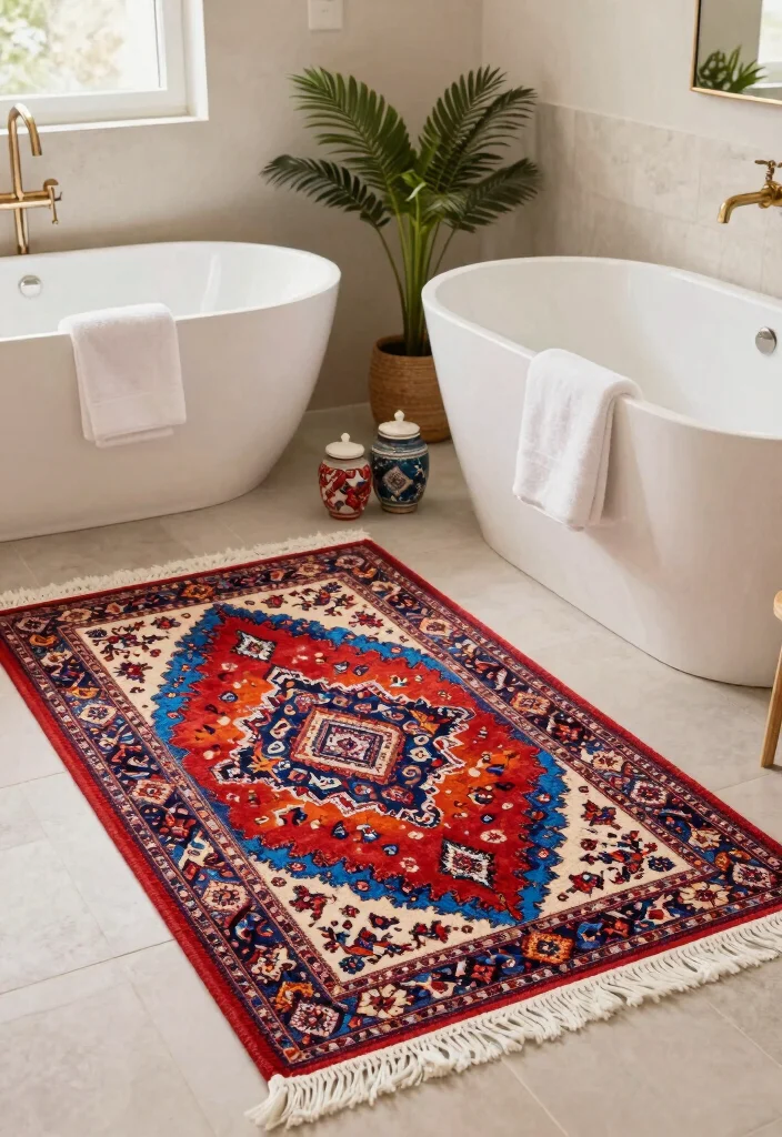 Look for washable and quick-drying materials to keep your bathroom clean and fresh. Pair your rug with coordinating accessories like colorful towels and decorative jars for a cohesive look.