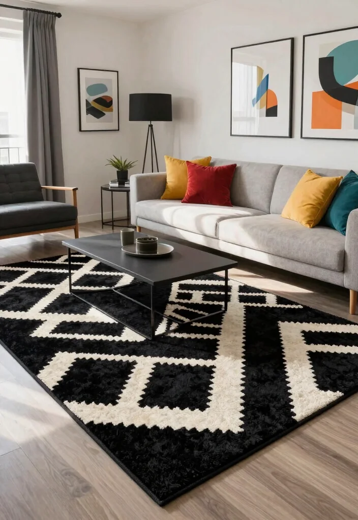 Pair a modern black rug with light furniture and plenty of white or neutral walls to keep the room bright. Use floating shelves or a mirror to reflect light and create the illusion of more space, and keep clutter to a minimum so the bold rug remains the focal point.