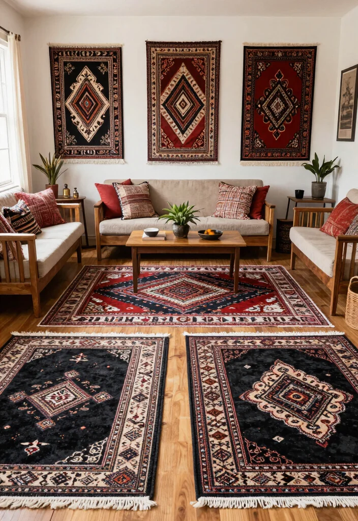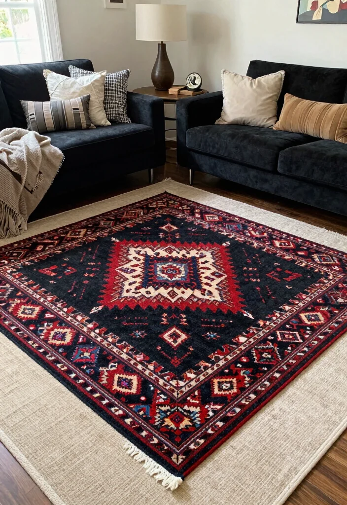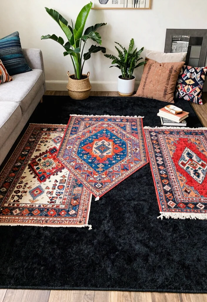 Fun fact: Layering rugs tricks the eye—two sizes create depth, especially with black area rugs. Start with a large base rug and add a smaller, colorful layer; designers say this boosts perceived warmth by up to 30% in bohemian spaces.