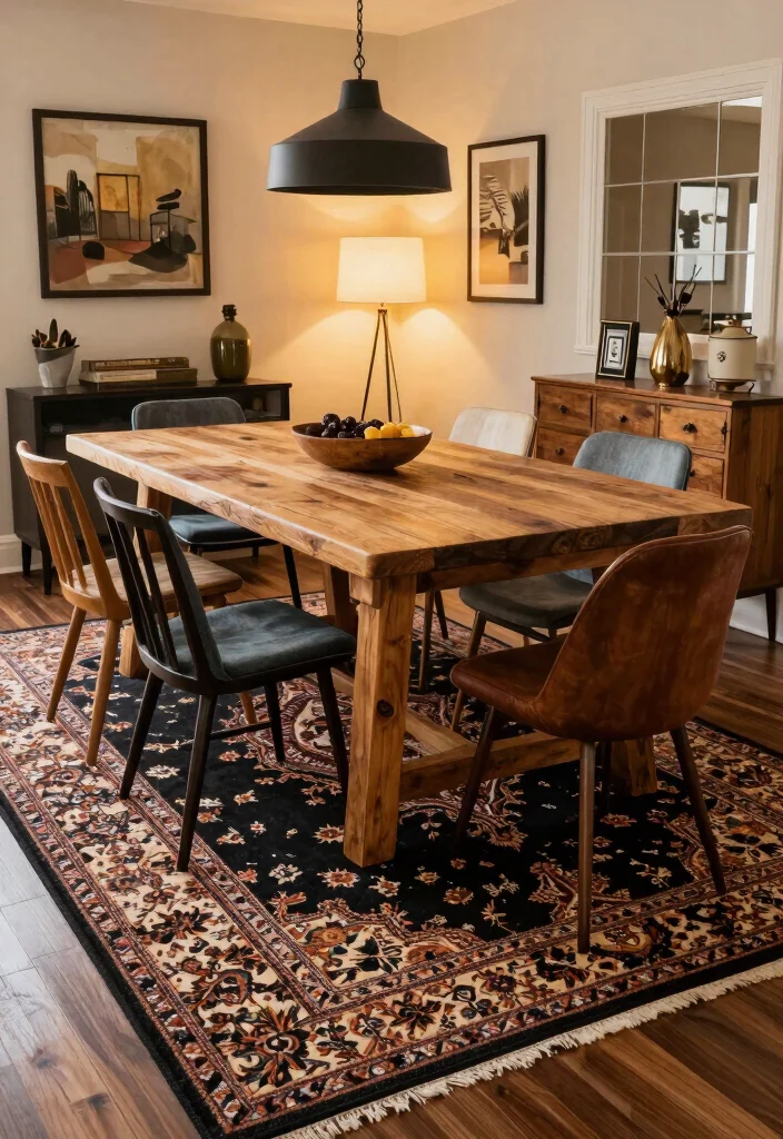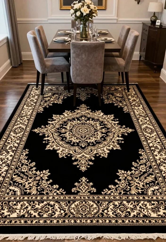 Fun fact: Vintage-inspired black area rugs with faded motifs add instant depth—2x the warmth of plain rugs. Place one under a rustic dining table, and watch 3 seating zones feel united and cozy, even in eclectic spaces.