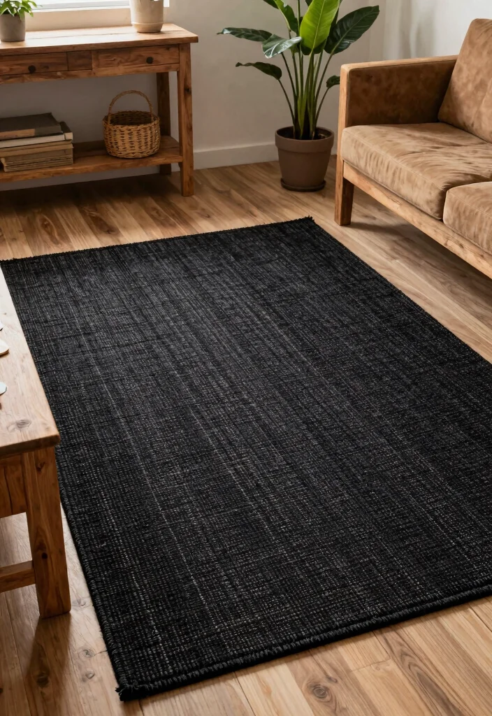 For those who appreciate the beauty of natural materials, a black area rug made from jute or sisal brings both texture and rustic charm. These durable rugs add an organic element to your decor, making them perfect for a cozy, bohemian-inspired interior. The natural fibers contrast beautifully with the sophistication of a black backdrop, making them an ideal choice for understated elegance. Pair it with wooden furniture and plenty of greenery for a harmonious, grounding effect.