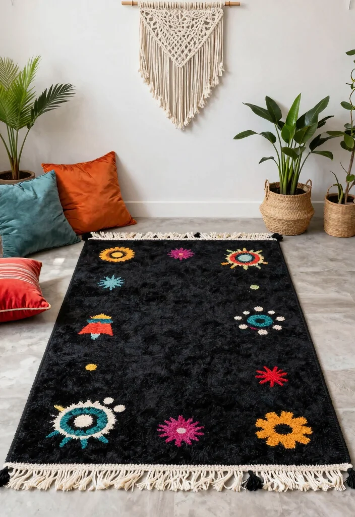 Choose textured black rugs to create a cozy atmosphere and enhance the tactile experience of your room.