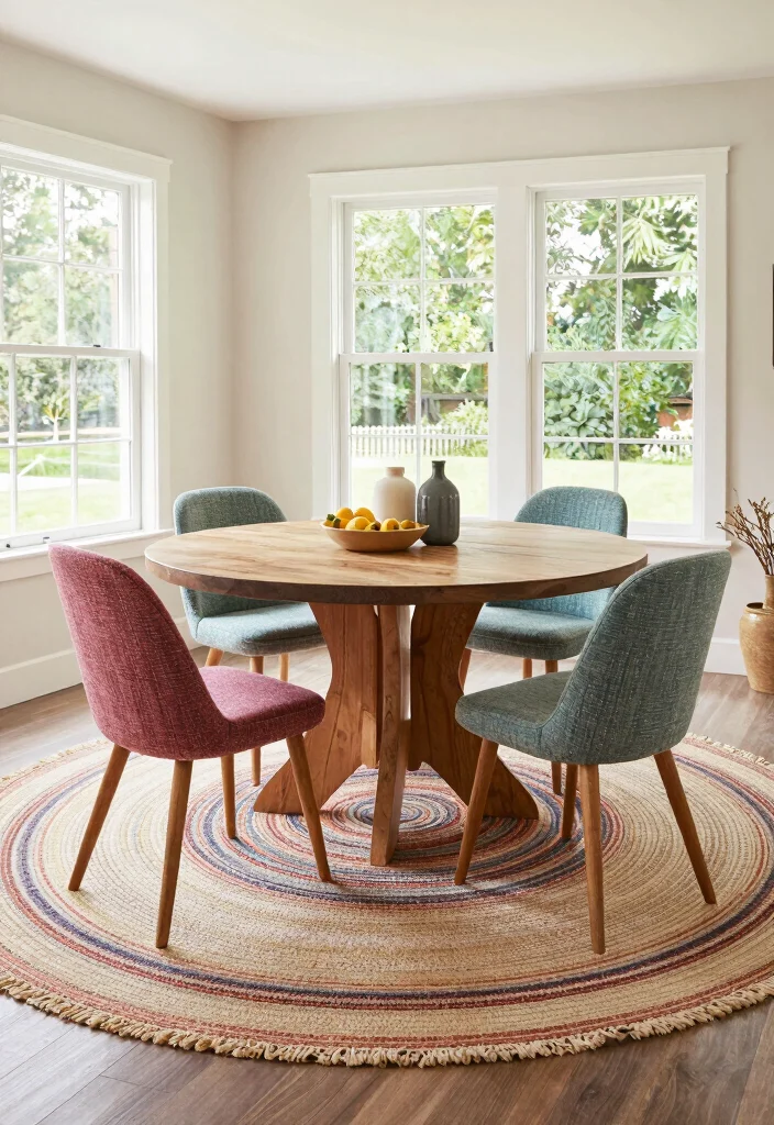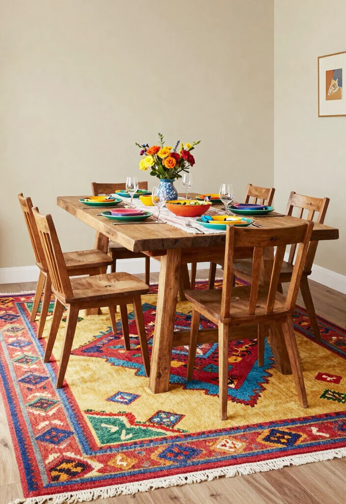 – Use a bright patterned rug under the dining table for a cheerful atmosphere.