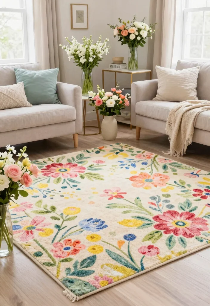 – Use a floral rug for spring and transition to warm, earthy tones in colder months.