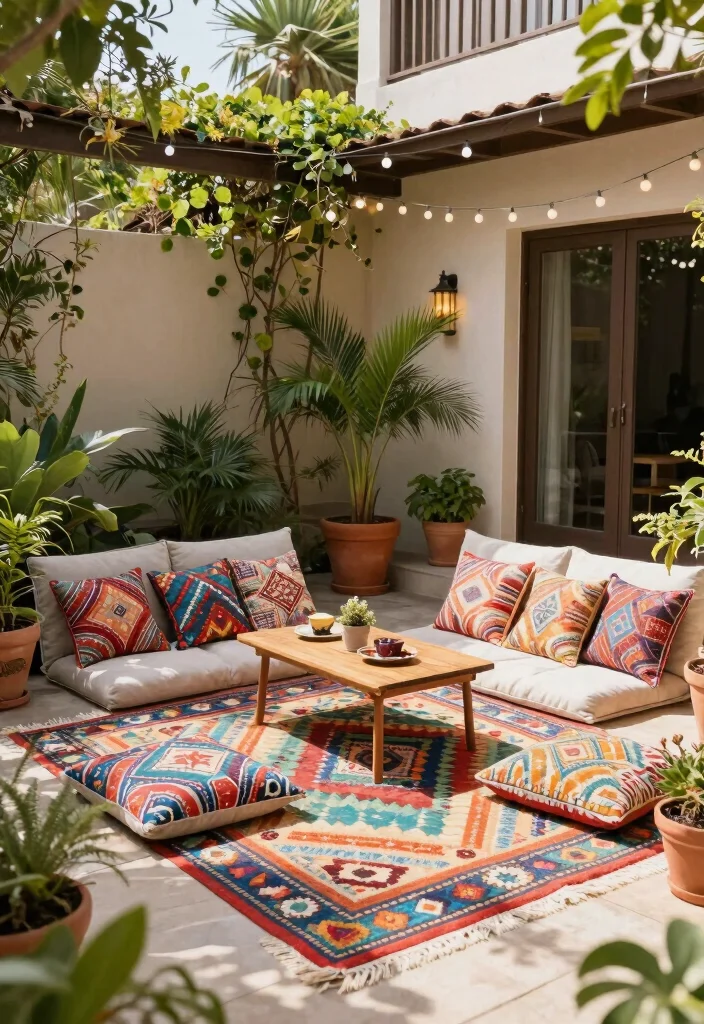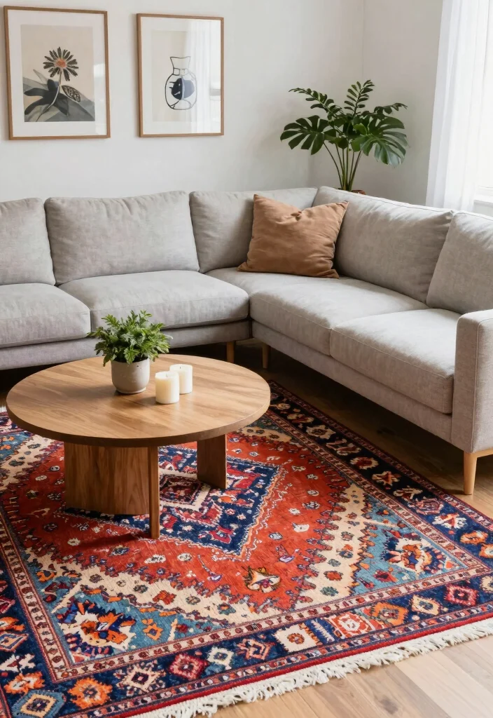 Layering is common in free-spirited interiors—start with a larger base boho rugs and add a smaller accent rug to create zones around a coffee table. Leave at least a 12–18 inch border around the rug for a breathable, comfy vibe.