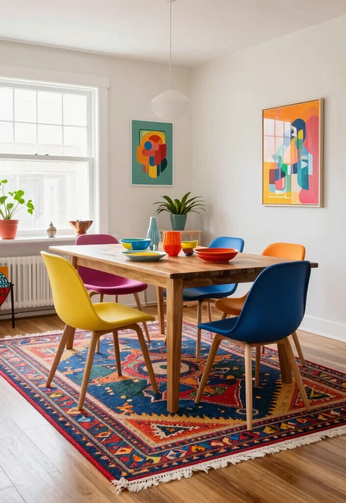 – Use a bright rug in the dining area to enhance mealtime vibrancy.