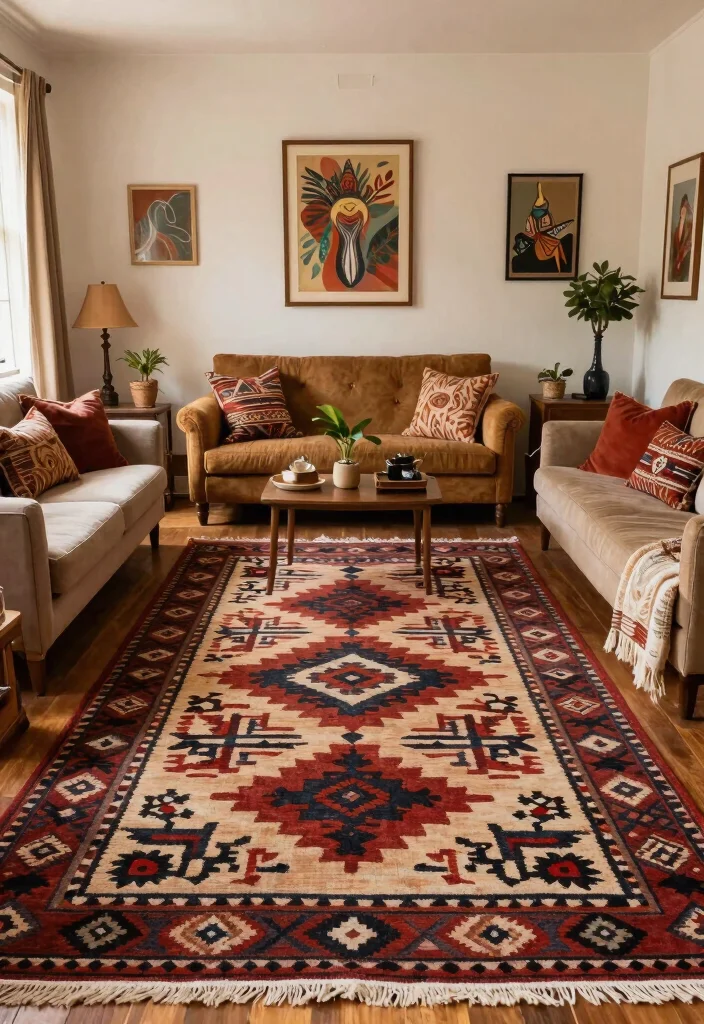 The key is balance. Start with a calm base in neutrals and natural textures. Choose one dominant color from your tribal pattern rug and echo it in cushions or wall art to tie the space together.