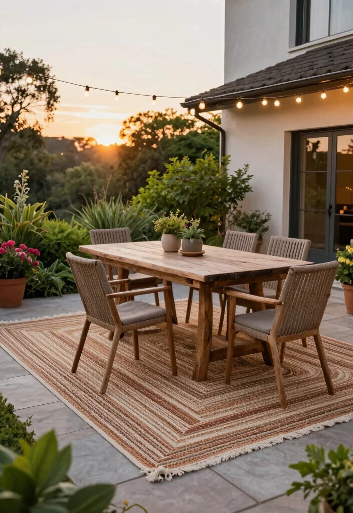 – Define seating areas on the patio with rugs.