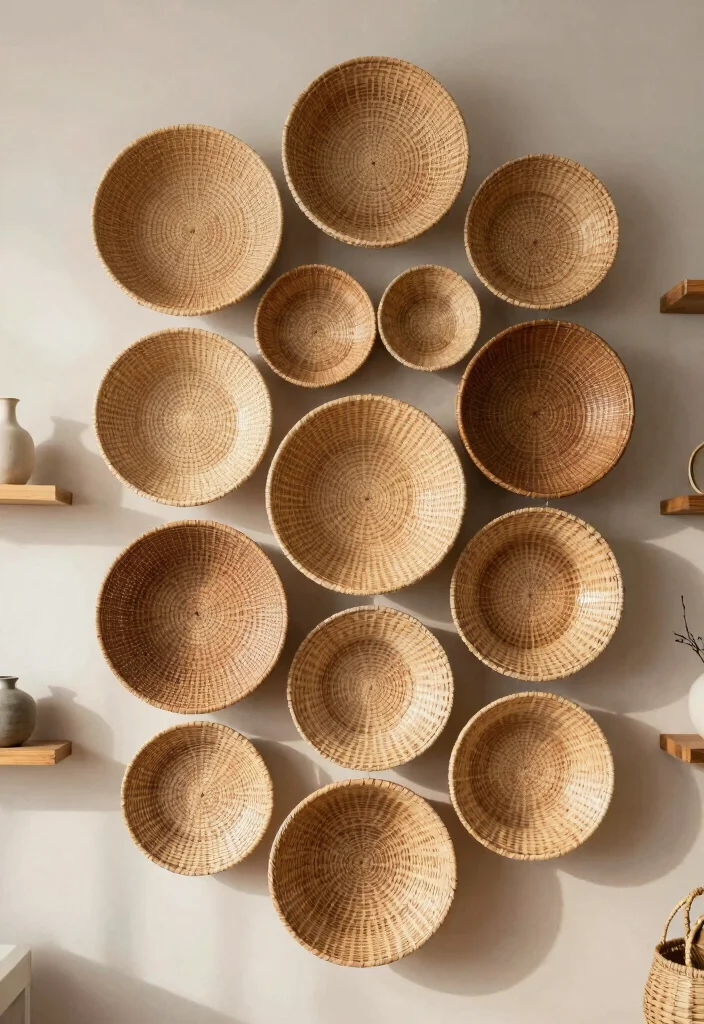 Break away from traditional flat wall art by using cane baskets to create stunning three-dimensional decor. Arranging various sizes and shapes of baskets into a beautiful pattern can serve as a captivating focal point in your living room or hallway. This unique decor idea adds depth and texture, enhancing the overall ambiance of your space.