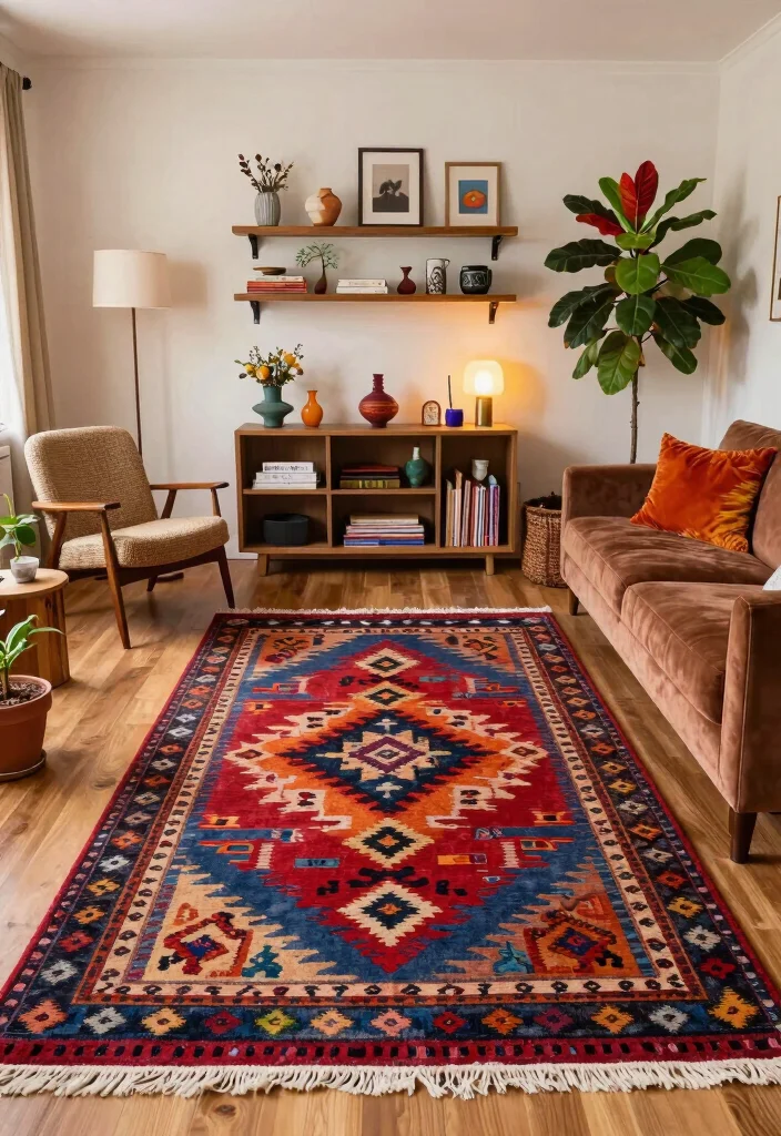Finish with a few decorative accents and ensure lighting highlights the rug’s texture.
