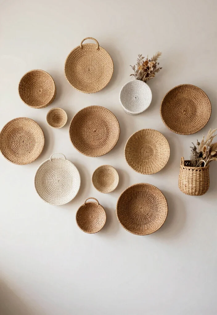 Use textured woven wall baskets to add depth and interest to your room’s decor while saving floor space.