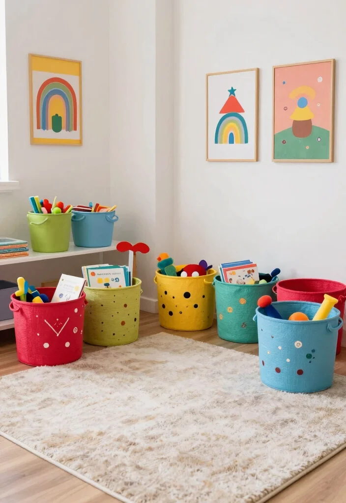 Foster creativity with decorative baskets designed for kids’ art supplies. These baskets can hold everything from crayons to paper and paint, keeping their creative space organized and accessible. Choose baskets in bright colors or fun shapes to inspire imagination and creativity.