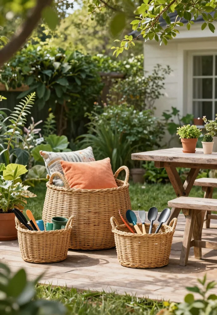Incorporate stylish baskets for outdoor storage, keeping your patio organized and enhancing its aesthetic appeal.