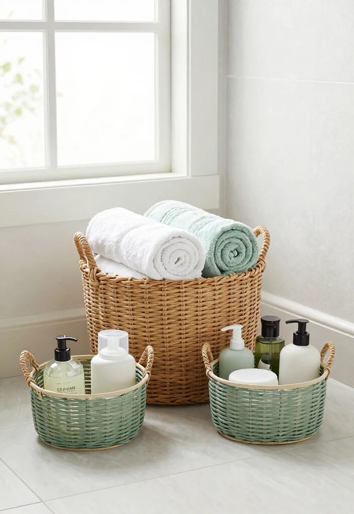 Organize your bathroom essentials in decorative baskets, adding style while keeping items easily accessible.