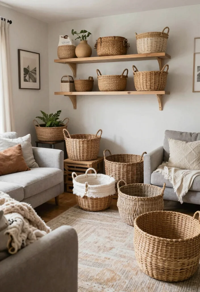 – Use baskets as decorative centerpieces on coffee tables or shelves.