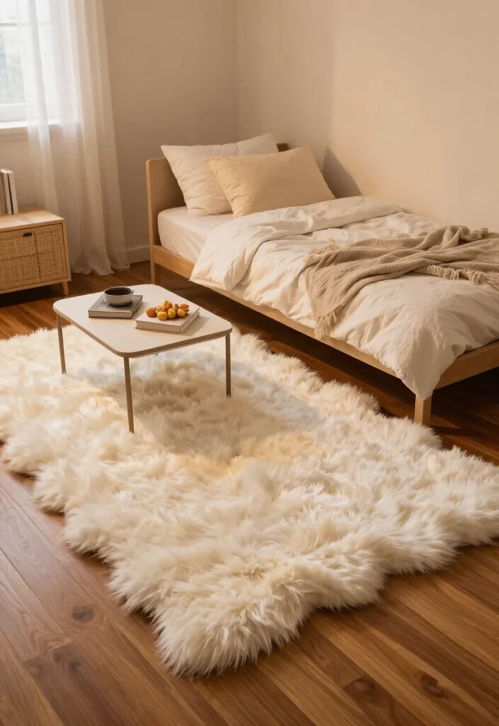 Add cozy faux fur rugs for a soft touch that enhances comfort and warmth in your dorm room.