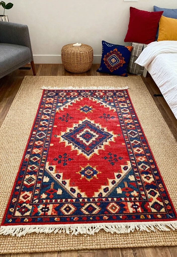 – Layer a cultural rug over a solid base to let its colors shine.