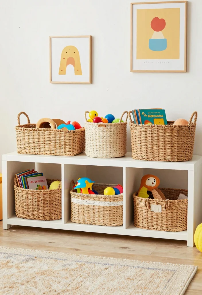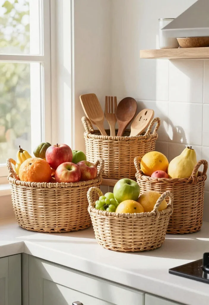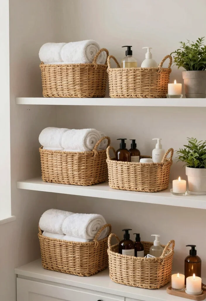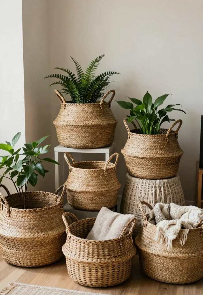 – Pair large woven baskets with smaller decorative ones for a layered look.