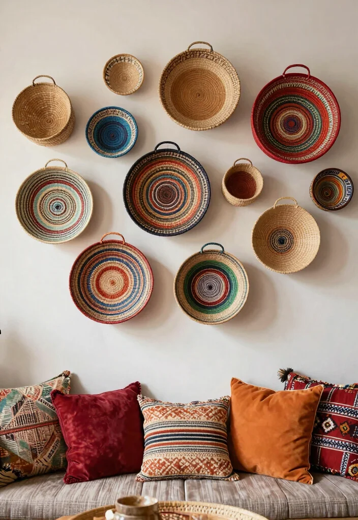 If you’re drawn to a bohemian vibe, colorful hand woven baskets can infuse your space with personality and flair. These vibrant pieces serve not only as practical storage for throws and pillows but also as eye-catching wall decor. Imagine a mix of baskets hung at varying heights, creating an eclectic gallery that captivates every glance.