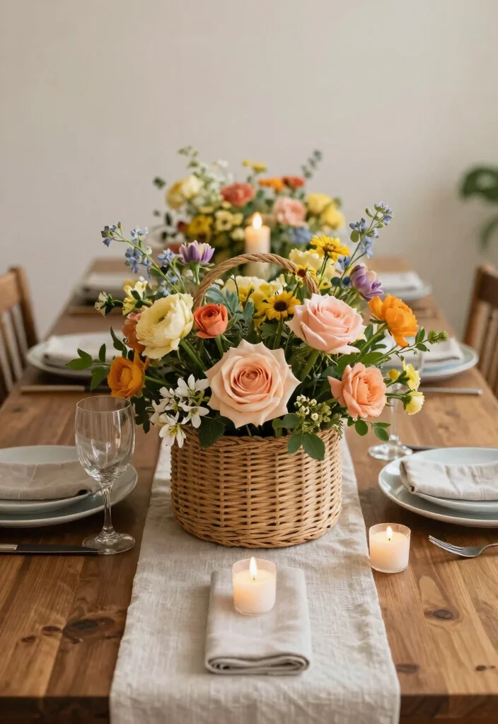 Transform your dining table with a woven basket as a centerpiece, filled with seasonal flowers or fruits.