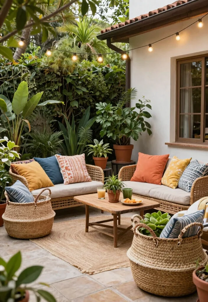 Utilize larger hand woven baskets to create inviting outdoor living areas, perfect for plants or relaxation.