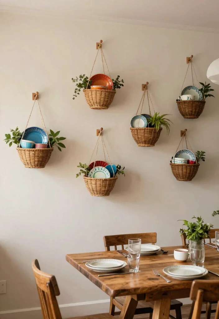 Hang a variety of baskets to hold bowls, plates, or cups, creating a personal touch in your kitchen decor. This method not only enhances storage but also turns your tableware into a decorative feature.
