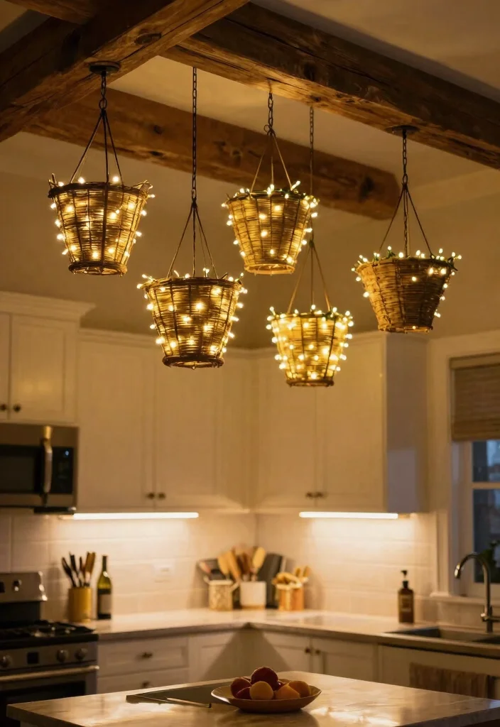 Create a cozy ambiance in your kitchen by using hanging baskets as lighting fixtures. This innovative idea combines decor and functionality in a delightful way, adding warmth to your cooking space. Imagine lightweight baskets elegantly holding string lights, casting a soft glow that invites relaxation and comfort.