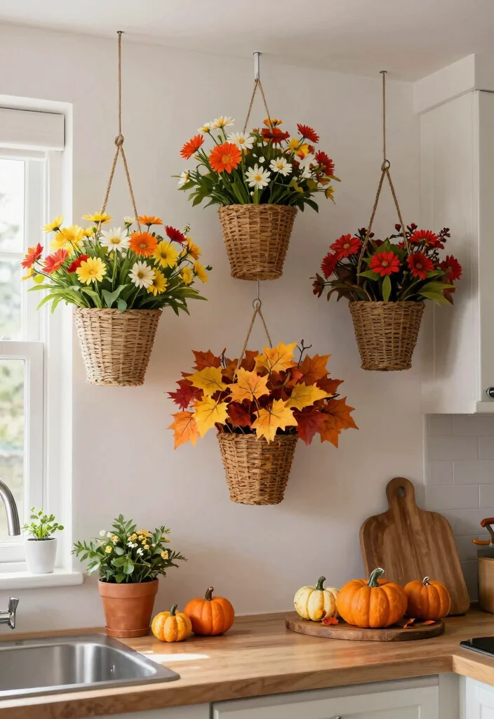 Refresh your kitchen’s look throughout the year by using hanging baskets for seasonal decor. This approach allows you to embrace the colors and themes of each season, keeping your kitchen lively and engaging. Picture baskets filled with faux flowers in spring or colorful leaves in autumn, beautifully adapting to the changing seasons.