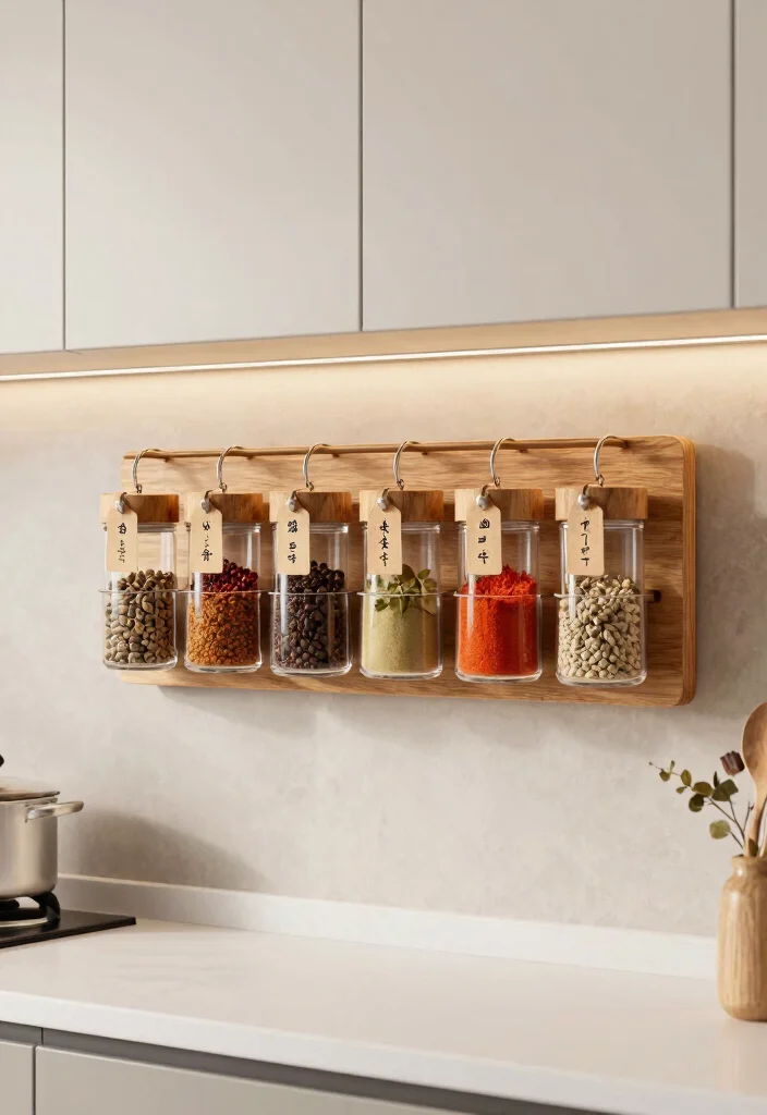 Install hooks or a rail to hang baskets filled with your favorite spices, ensuring they are readily available while cooking. This method promotes a tidy setup while showcasing your spices beautifully.