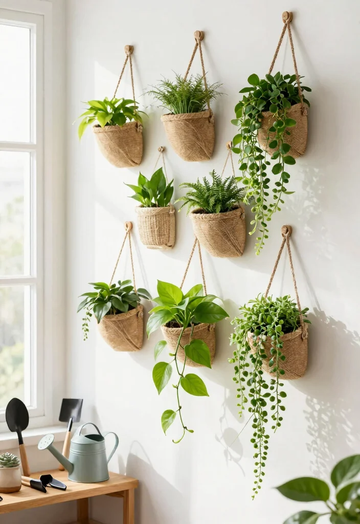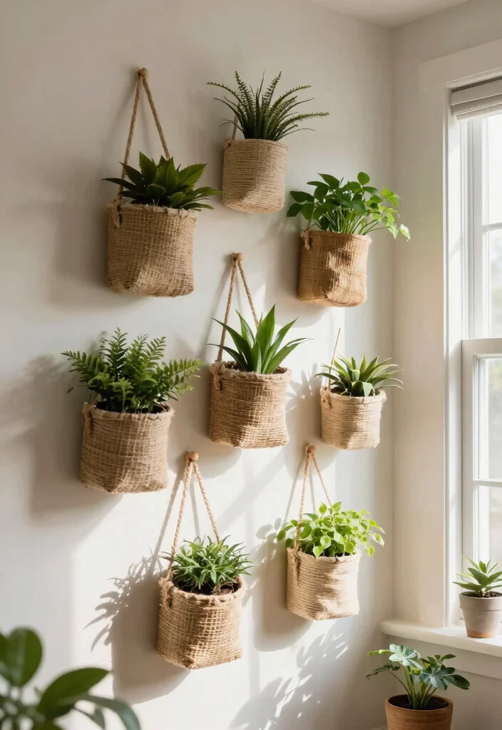 Create a serene retreat by transforming a simple wall into a cozy plant haven with hanging wall baskets. This design works beautifully by cradling your favorite greenery in natural fiber baskets, promoting visual harmony and a sense of tranquility in your space. Pair these baskets with vibrant trailing plants like pothos or string of pearls for a cascading effect that invites nature indoors.