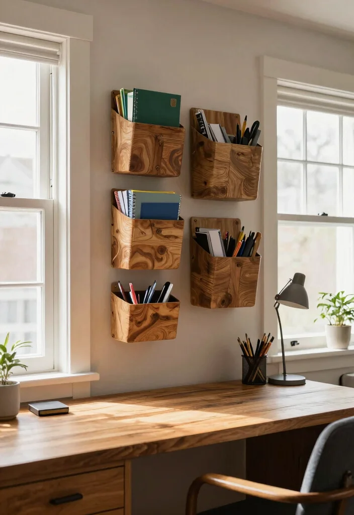 Brighten your workspace with hanging wall baskets that keep office supplies organized and within easy reach. This idea merges practicality with rustic charm, creating a warm and inviting atmosphere in your home office.