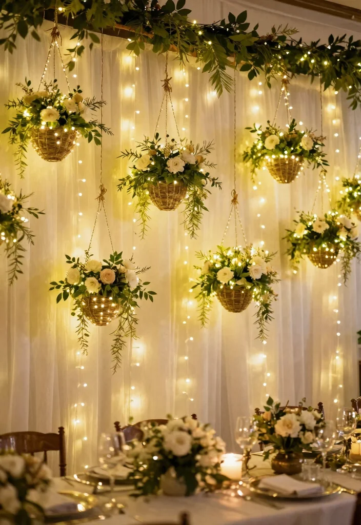 Select baskets that align with your event theme and colors, hanging them at varying heights for a dynamic look. Incorporating lights or greenery can further enhance the romantic atmosphere, making your event truly special.