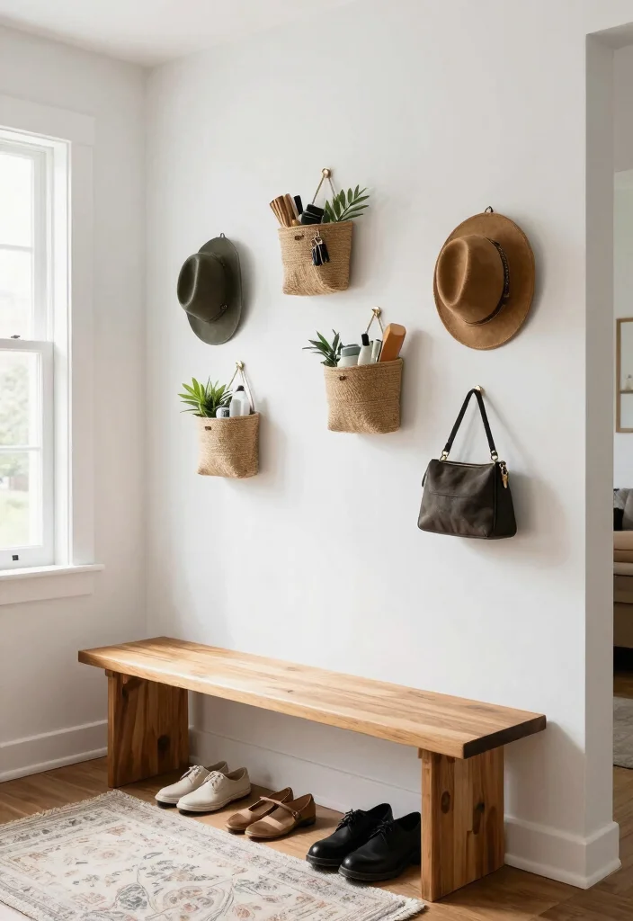 Transform your entryway into a practical and stylish space with hanging wall baskets that serve both decorative and functional purposes. Opt for sturdy baskets to hold essential items like keys, hats, and bags, ensuring everything is within easy reach when you need it.