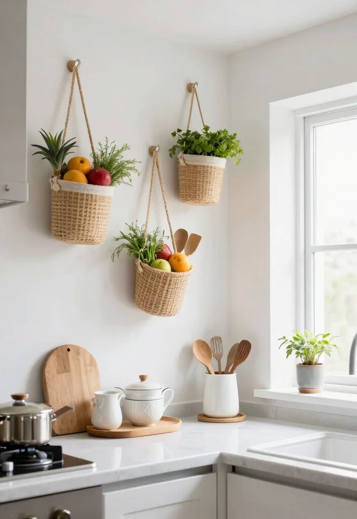 Revolutionize your kitchen storage with hanging wall baskets that combine style and functionality. These baskets are perfect for storing fresh produce or utensils, ensuring everything is organized and easily accessible while adding a decorative flair.