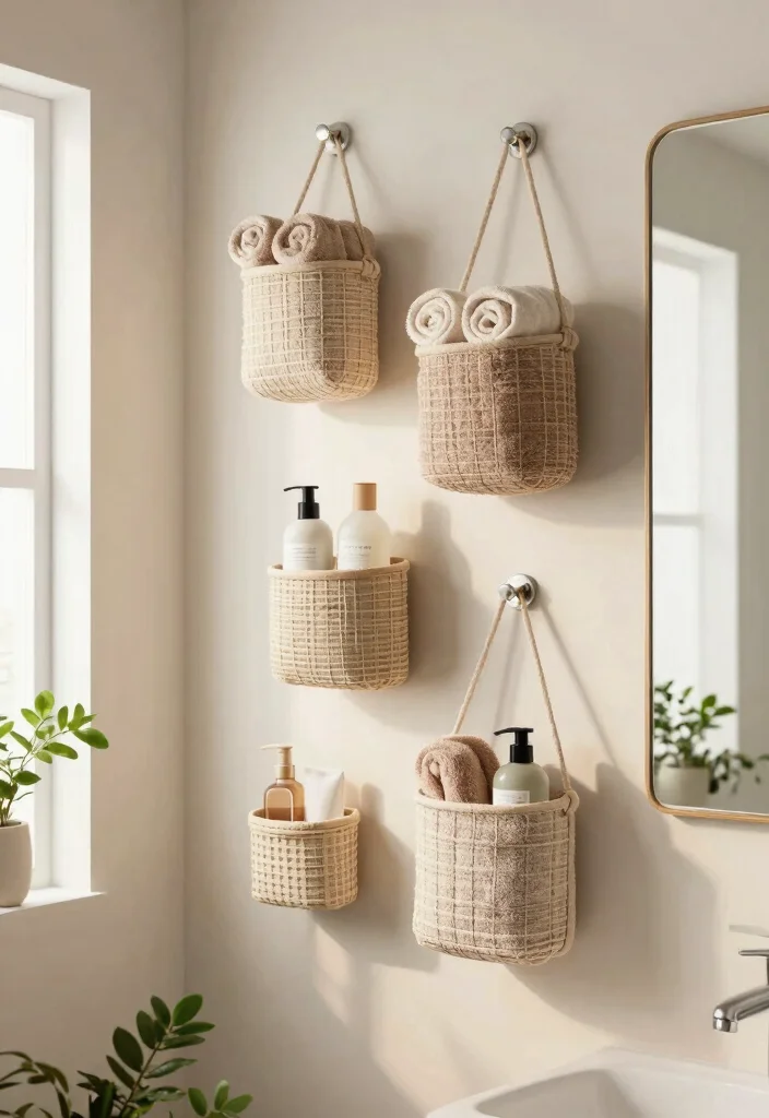 Elevate your bathroom decor with hanging wall baskets that provide stylish storage solutions. These baskets can hold towels, beauty products, or toiletries, keeping your bathroom neat and organized while adding a touch of elegance.