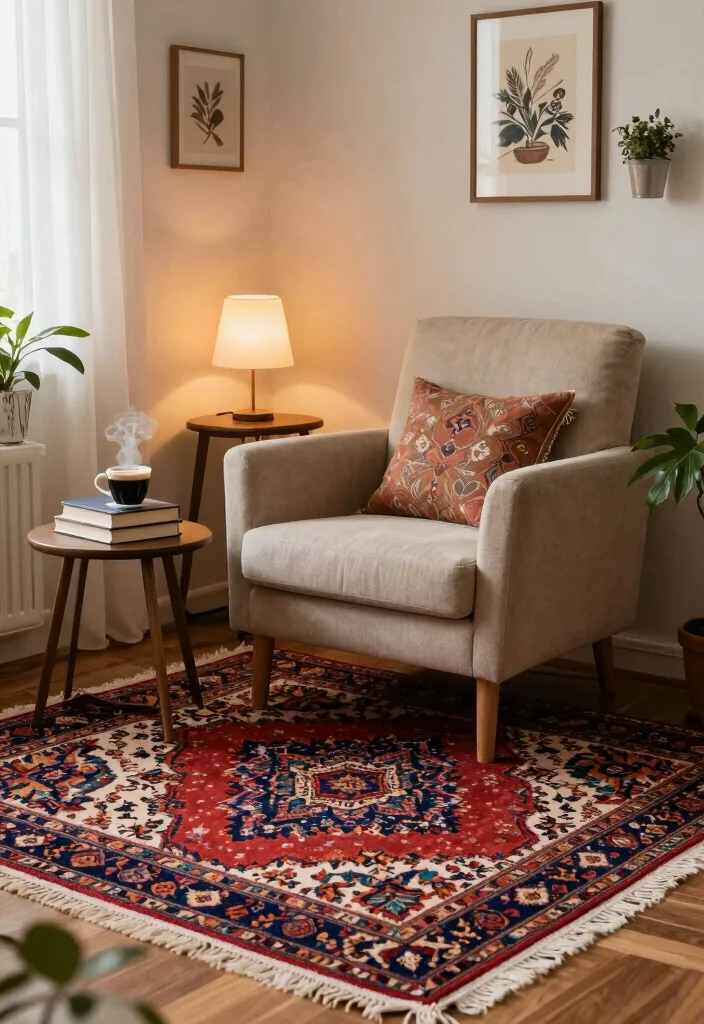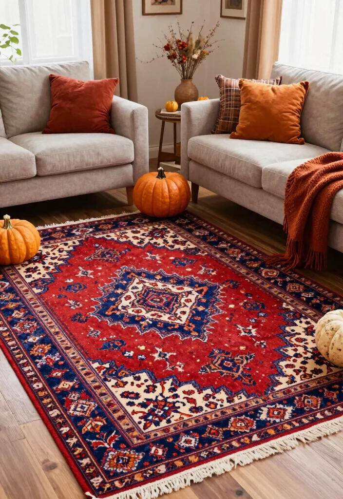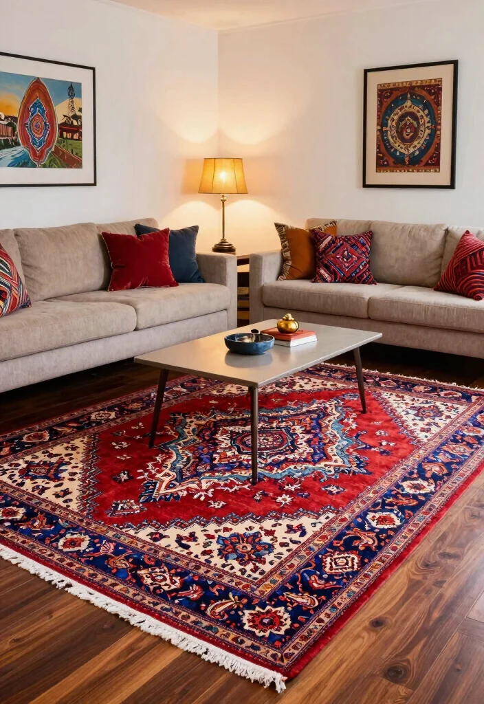 – Use decorative elements that resonate with the rug’s colors.