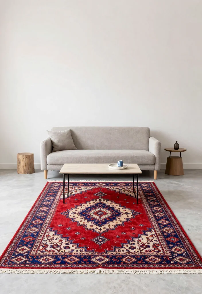 This strategy highlights the rug’s cultural significance while maintaining modern simplicity, resulting in a serene living space.