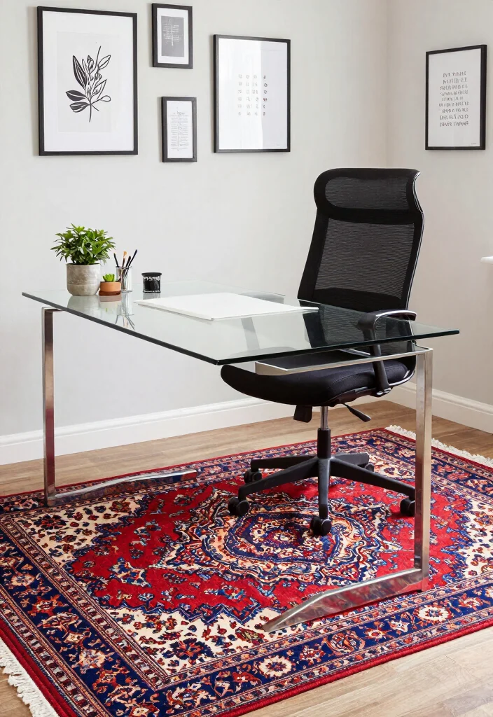 Choose a rug that resonates with your personality and enhances your creative flow. Opt for a low-pile rug that’s easy to clean, ensuring functionality alongside beauty.
