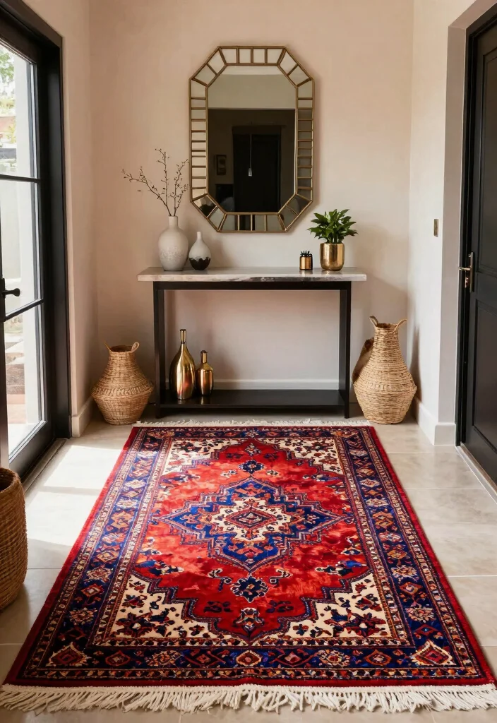 Opt for a low-pile rug that withstands foot traffic and is easy to maintain. Place it underneath a console table adorned with decorative elements that complement the rug’s hues.