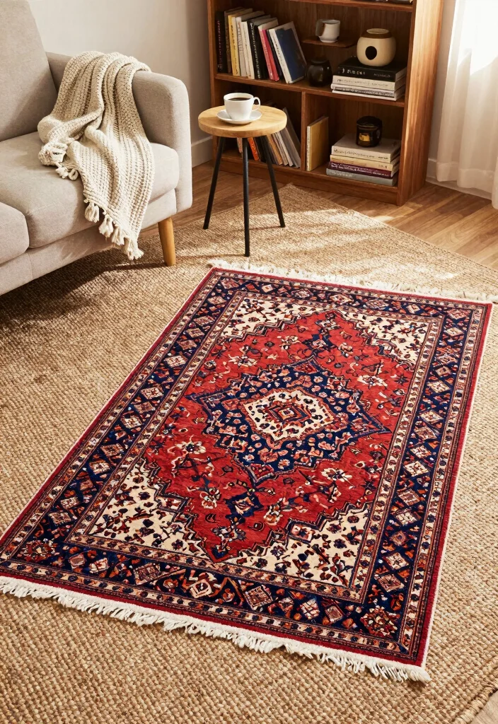 For example, a neutral jute rug as a base paired with a colorful Iranian rug creates an inviting contrast.