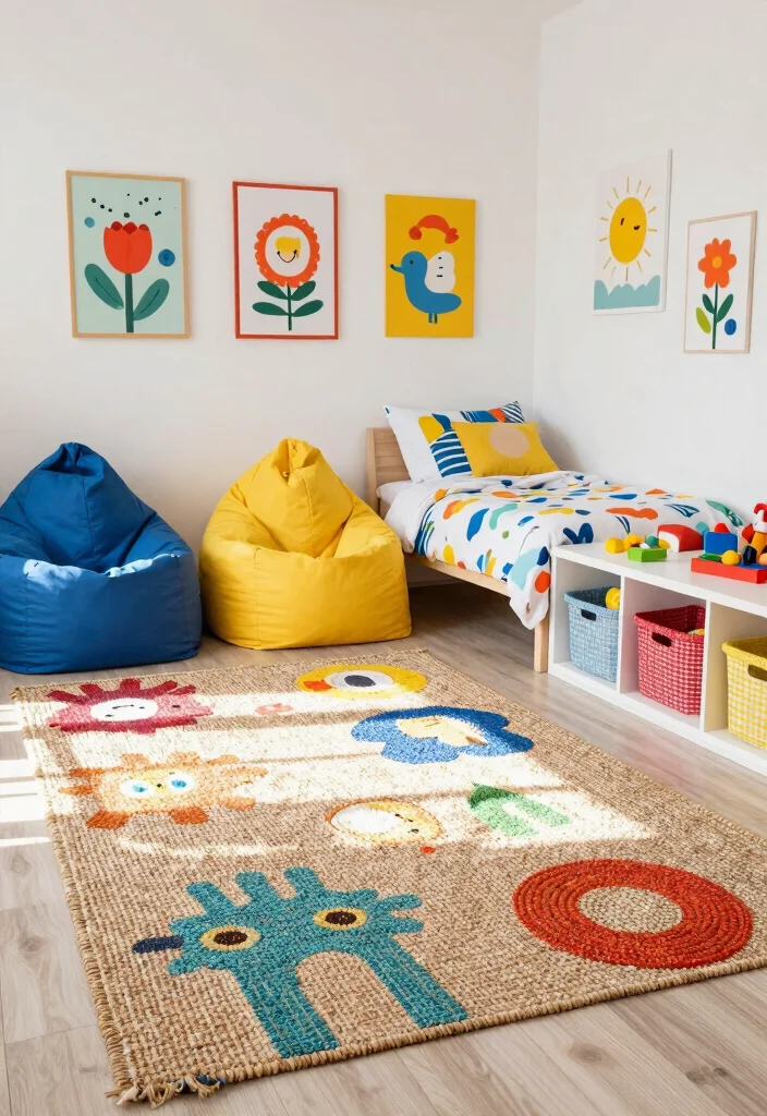 Use playful jute rugs in kids’ rooms to provide a soft, safe, and eco-friendly play area for children.