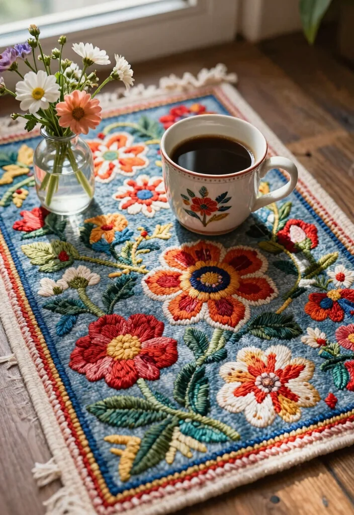 Unleash your creativity with embroidered mug rugs that showcase intricate designs and personal flair. These handmade items can feature everything from floral patterns to meaningful quotes, turning your mug rug into a beautiful piece of art. Imagine a rug adorned with vibrant floral embroidery, adding a lovely touch to your coffee corner.