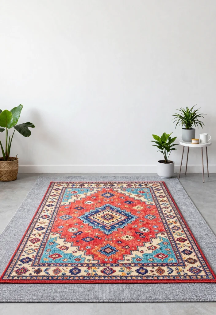 To implement this, choose a vibrant rug that contrasts well with your existing decor. Use color theory to select hues that complement each other and enhance the overall aesthetic. Keep other design elements minimal to allow the rugs to truly stand out and take center stage.