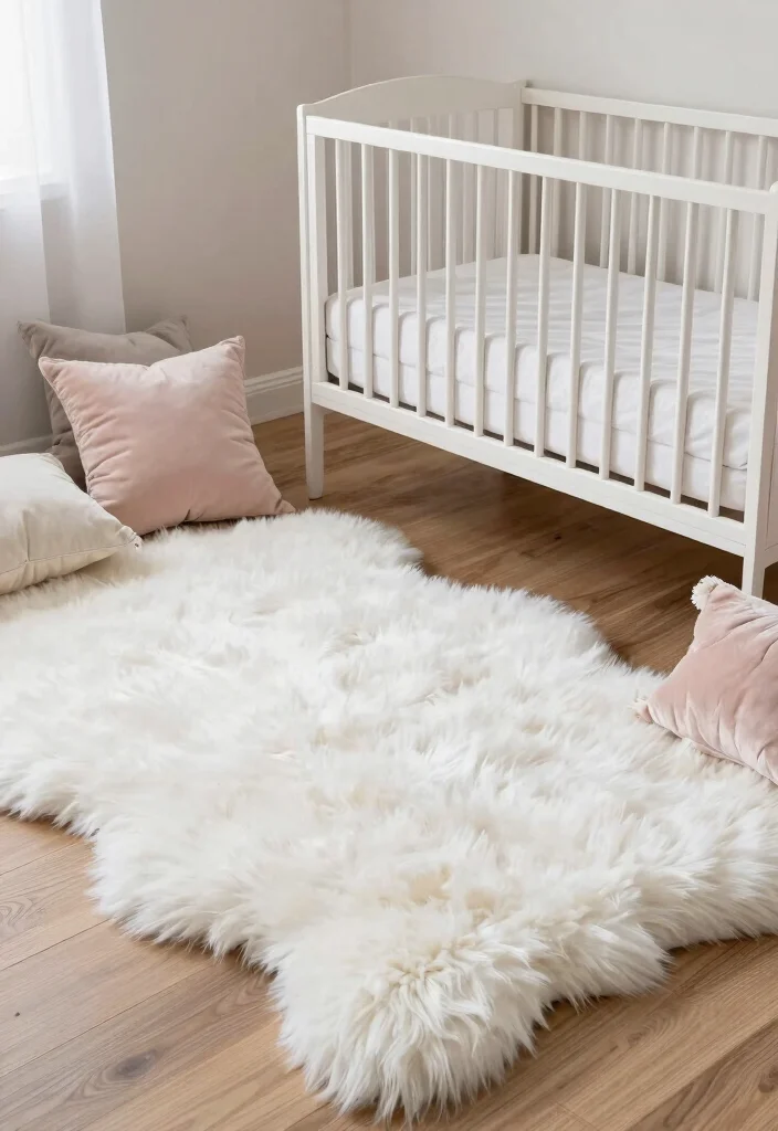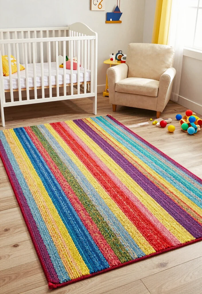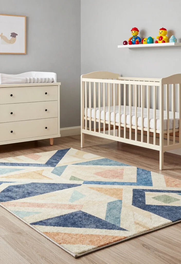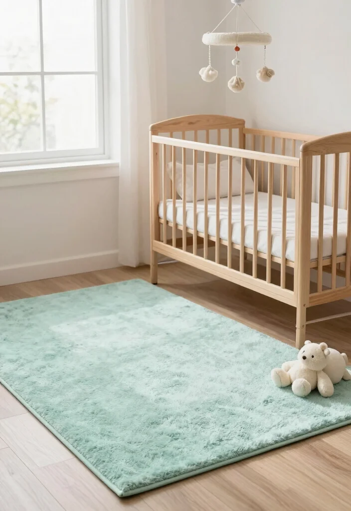 Size and placement matter: consider a 4×6- or 5×8-foot rug for standard layouts, or a small 2×3-foot rug beside the crib for a cozy anchor.