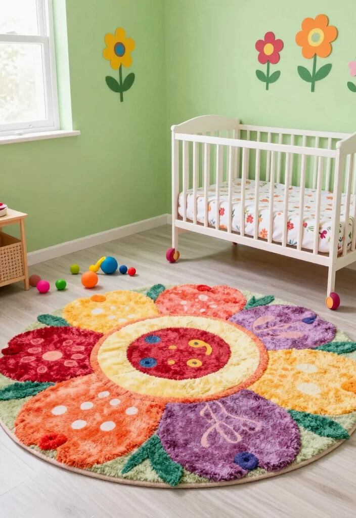 Rugs shaped like animals, clouds, or flowers can add a delightful whimsy to your nursery. These playful designs not only provide a cozy area for your little one to play but also function as charming decor elements that enhance the overall theme of the room. Imagine a cloud-shaped rug nestled in a sky-themed nursery or a flower-shaped rug brightening up a garden-inspired space.
