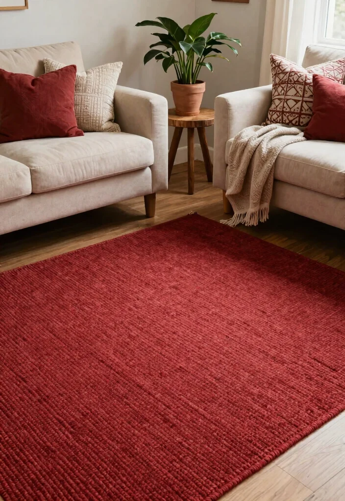 Woven rugs with unique textures can add an artisanal touch to your interior. A red woven rug can provide warmth and a handcrafted feel that enhances a bohemian style.