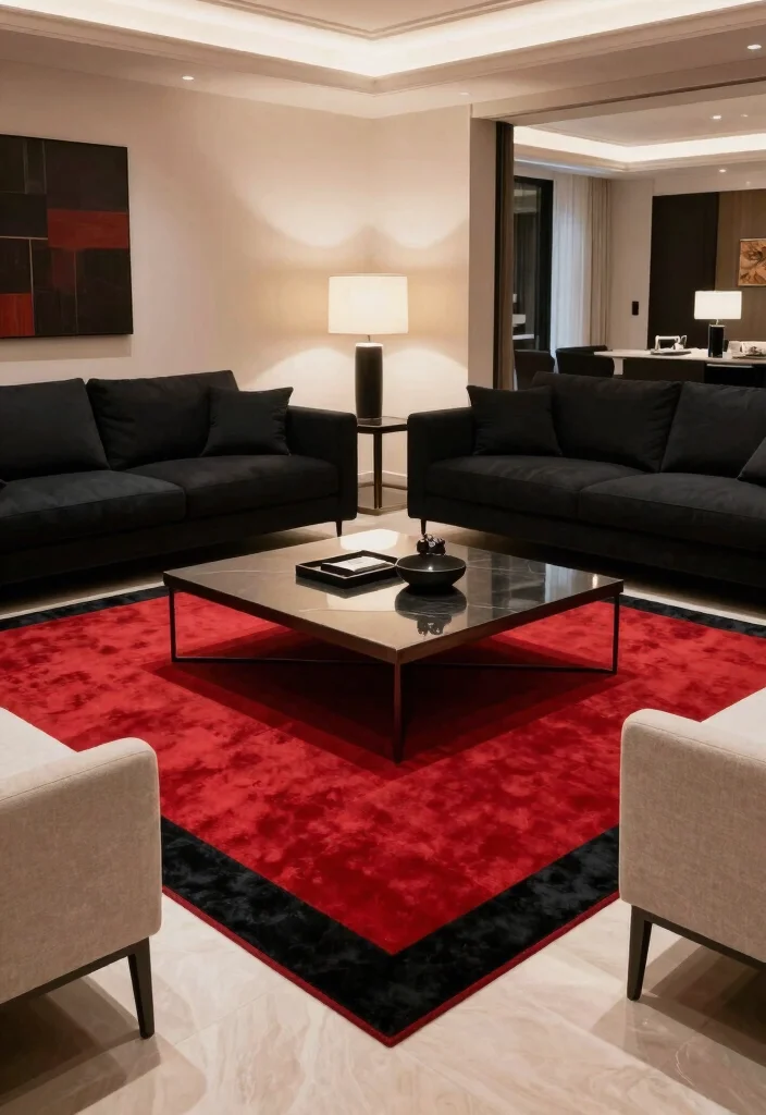 For those who love bold design, a monochrome scheme with varying shades of red can make a powerful statement. Choosing a red rug alongside furniture or decor items in similar hues creates a cohesive and dramatic atmosphere.